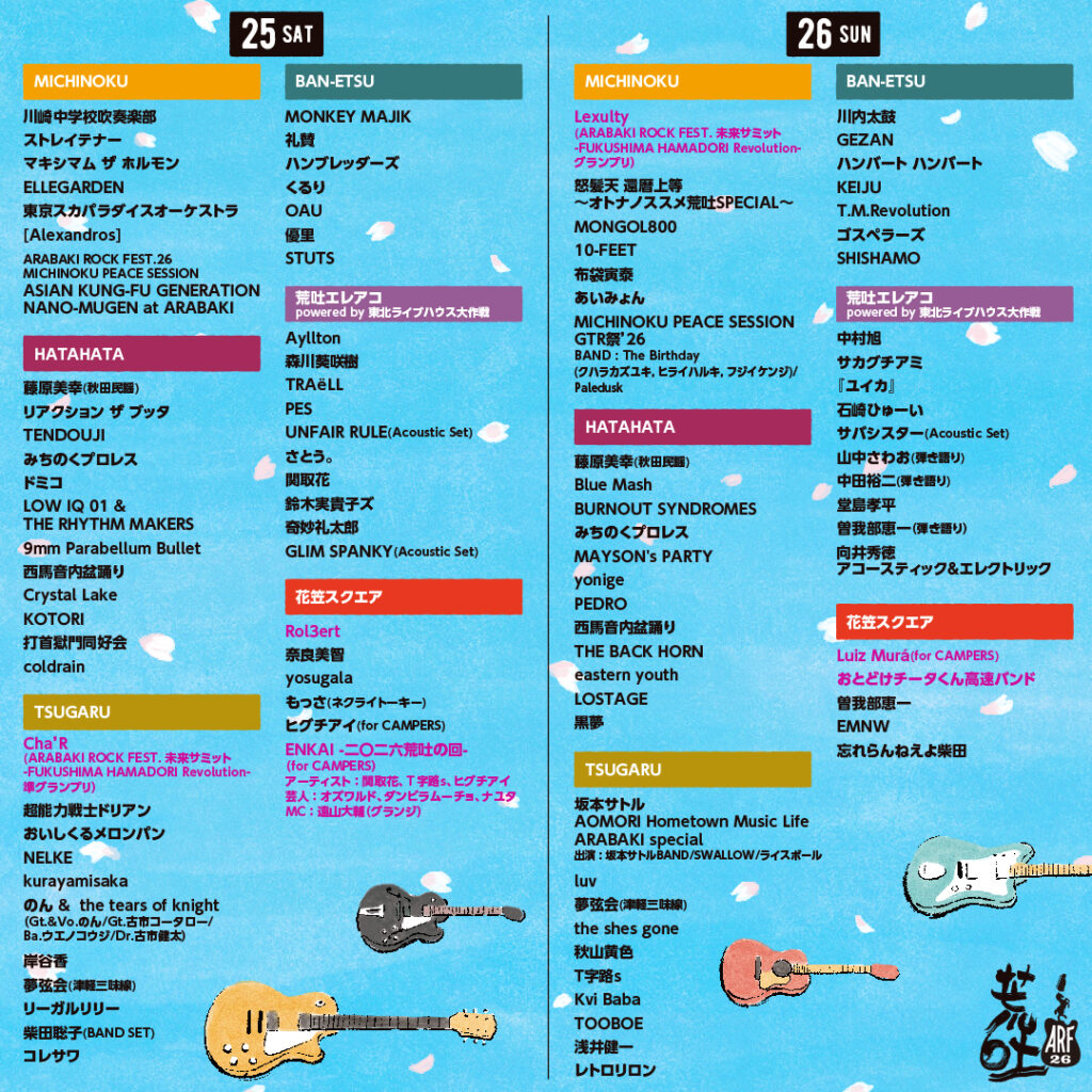 宮城県柴田郡川崎町 国営みちのく杜の湖畔公園 北地区 エコキャンプみちのくで4月25日(土)、26日(日)に開催される「ARABAKI ROCK FEST.26」のタイムテーブルが発表されました。